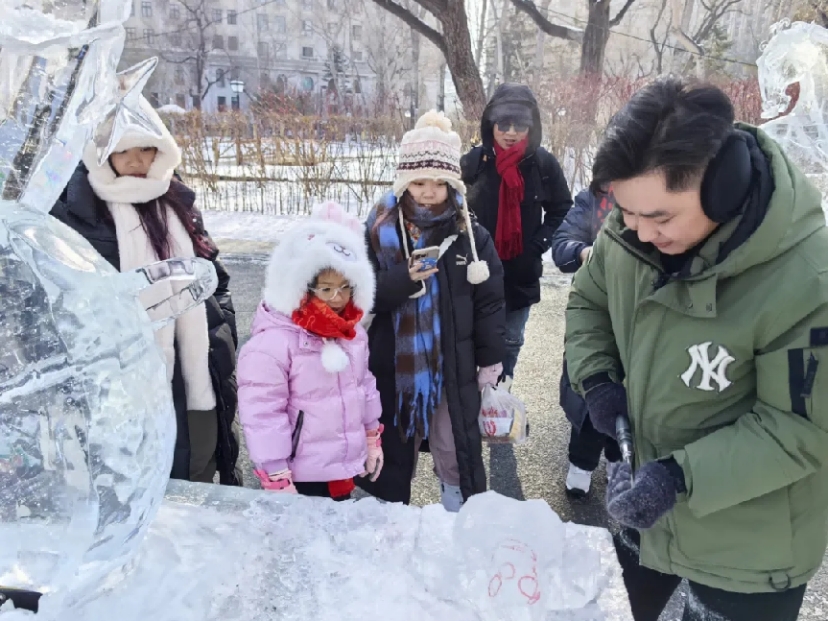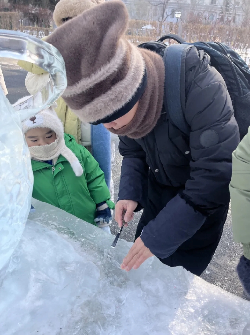 活动现场还设置了互动体验区。许多游客接过师生们准备的简易冰雕工具,在专业指导下尝试用碎冰进行雕刻,欢声笑语与晶莹冰屑一同飞扬。艺术以最亲切的方式走进了人群。一位来自吉林省的初二学生,在长时间观摩和亲手体验后,主动向师生提问:老师,你们学校教这个吗? 录取要多少分?冰雪艺术的种子,正是在这样的互动中悄然播下。