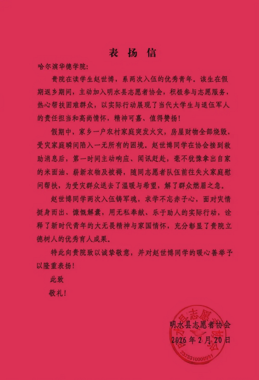 日前,一封来自明水县志愿者协会的表扬信,跨越千里寄抵哈尔滨华德学院,信中那句“两次入伍铸军魂,求学不忘赤子心”,不仅是对一名青年的由衷赞誉,更揭开了哈尔滨华德学院数据科学与信息工程学院2022级学生赵世博的日常—— 他是一名大三学生,更是一名两度穿上军装、把责任刻进骨子里的退伍军人。