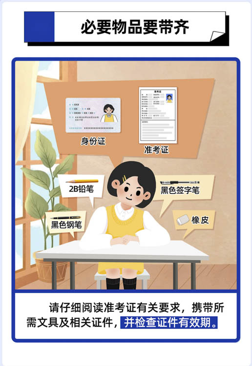 考试当日,考生须持本人有效居民身份证(或临时居民身份证)原件和纸质准考证参加考试,二者缺一不可。请您务必提前检查身份证件的有效期限,如发现考试当日证件已过期或丢失,请立即前往公安部门补办临时身份证,避免因证件问题无法入场。