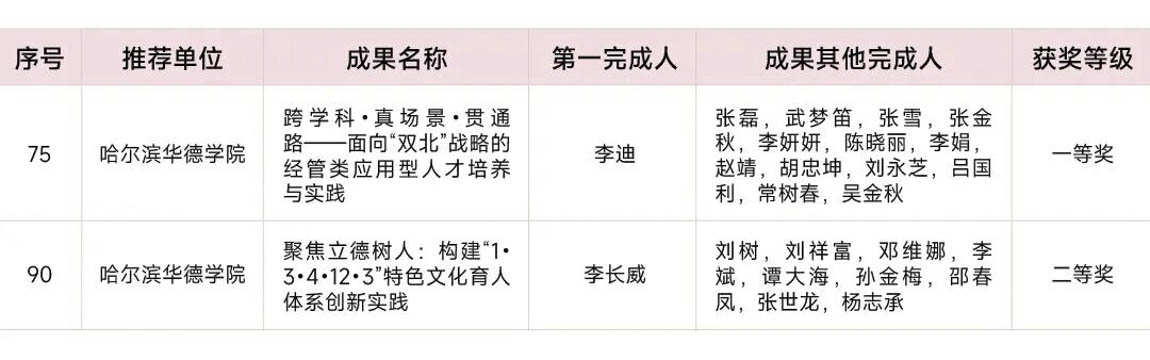 日前,2025年黑龙江省高等教育(本科、研究生)教学成果奖获奖名单揭晓,哈尔滨华德学院2项教学成果脱颖而出,斩获高等教育教学成果奖。其中,经济管理学院李迪教授主持的项目《跨学科·真场景·贯通路——面向“双北”战略的经管类应用型人才培养与实践》荣获一等奖;校长李长威教授主持的项目《聚焦立德树人:构建“1・3・4・12・3”特色文化育人体系创新实践》荣获二等奖。