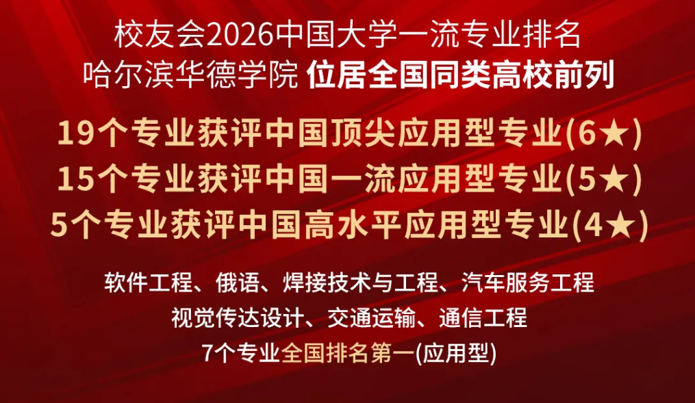 为了给2026年全国各地高考考生提供权威参考指南, 4月13日,全国第三方大学评价机构艾瑞深校友会网(Cuaa.net)正式发布校友会2026中国大学一流专业排名。 在这一权威榜单中,哈尔滨华德学院凭借卓越的办学实力与专业建设水平,交出了一份亮眼的成绩单: 19个专业获评中国顶尖应用型专业(6★)、15个专业获评中国一流应用型专业(5★)、5个专业获评中国高水平应用型专业(4★), 综合实力位居全国同类院校前列,充分彰显了哈尔滨华德学院在应用型人才培养领域的领先地位与广泛影响力。