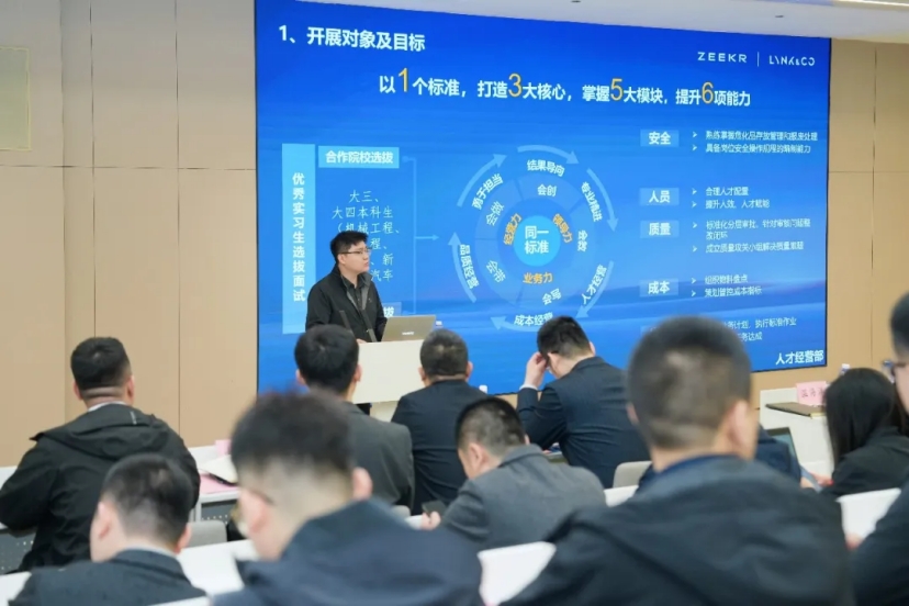 开班仪式上,领克汽车张家口工厂人才经营部高级经理刘洋系统介绍了本次“校企合作项目”的培养体系。该项目 面向汽车、机械、自动化等相关专业本科生, 以 “懂安全、善经营、会管理” 为培养目标,专门为吉利、领克、极氪等核心品牌定向培养生产管理人才。 项目构建了“1个标准、3大核心、5大模块、6项能力”的完整能力模型,为期7个月,分为在校前置培养、集中赋能培训、企业实战历练三个阶段。培养期间,校企双方实施双导师制,并建立全过程关爱保障机制,确保学生“进得来、留得住、有温暖、有成长”。