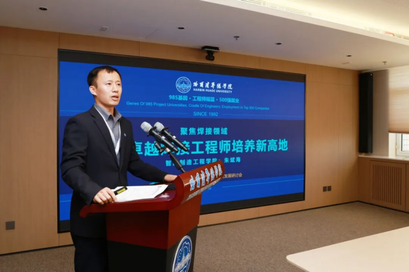 △在日前刚刚落幕的焊接技术与工程专业高质量发展研讨会上,朱斌海 老师 向在场专家、学者介绍哈尔滨华德学院相关专业建设情况