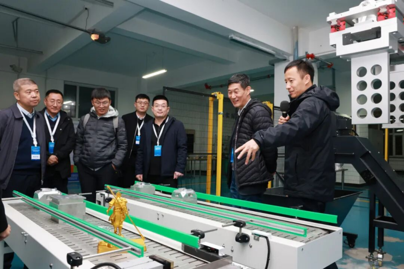 △朱斌海 老师 向来校参观的业内专家介绍学校智能制造实训室