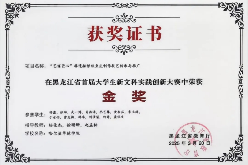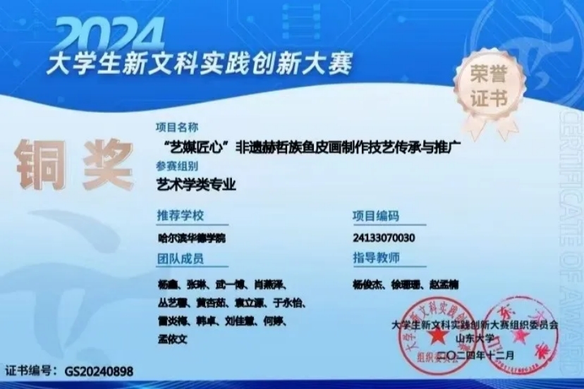 从一块朴素的鱼皮,在指尖的打磨下焕发新生,到走进社区课堂,在孩子们手中绽放惊喜;从国际舞台的文化交流,到网络世界的热烈回响—— 哈尔滨华德学院艺媒匠心团队的年轻人们,正在完成一场从技艺到文化的传承。 当青春的创造力与古老的智慧相遇,非遗不再是博物馆里的标本,而成为流淌在时代脉搏中的活水。正如指导老师杨俊杰所言:"我们见证的不仅是技艺的传承,更是一种文化生命力的延续。"