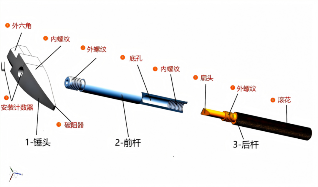 △“工匠锤”三维爆炸图,清晰展示锤头、功能杆等核心部件