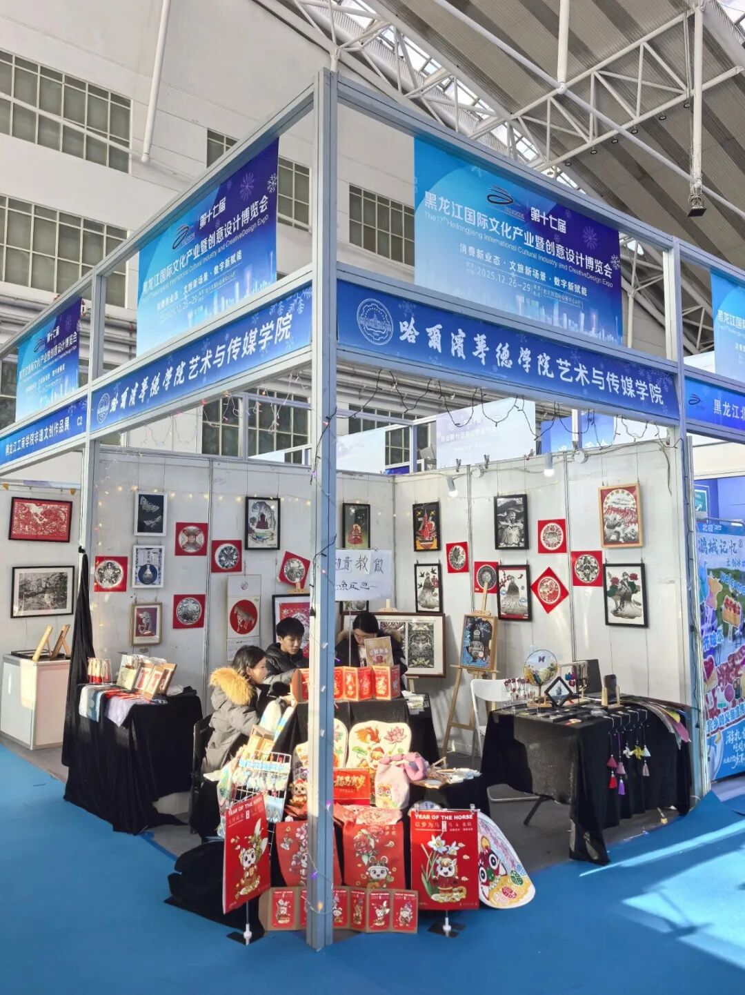 哈尔滨华德学院艺术与传媒学院作为非遗联盟重要单位受邀参展,全方位呈现了学院近年来在应用型人才培养、教学模式创新以及非遗传承与当代设计融合方面取得的扎实成果。 展会期间,艺术与传媒学院副院长徐珊珊、服装工程系主任李佳璇亲临展区,视觉传达设计系教师带领“艺媒匠心”学生团队全程负责策划、布展与讲解工作,充分展现了学院师生协同共进、教学相长的实践育人风貌。