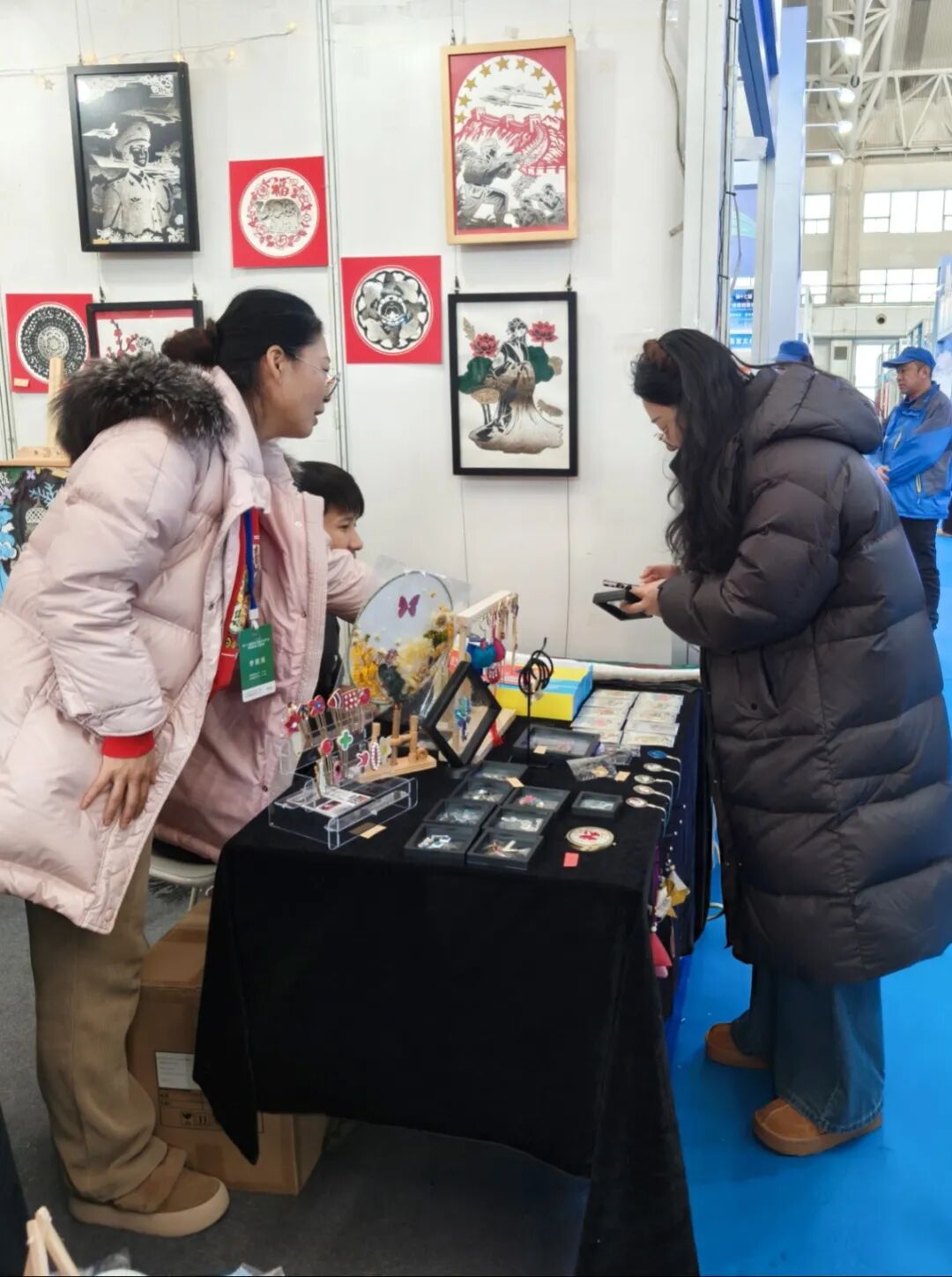 为增强观众的沉浸式体验与文化感知, 展区特别设置了非遗DIY互动体验区,免费向市民讲授赫哲族鱼皮文化及制作工艺流程 。该活动吸引了参观者驻足尝试,成为展区内人气高涨的亮点环节。这不仅是一次非遗文化的公益传播,更是学院将课堂延伸至社会、践行“在做中学、在学中创”实践教学模式的生动体现。同时,学生进一步巩固了专业技能,强化了文化传承的使命担当与创新实践能力。