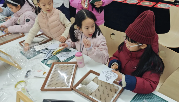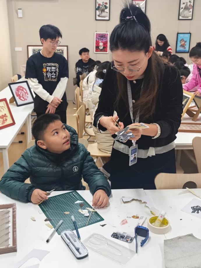 随后,师生移步至学校的非遗传承工作室。在这里,国家级非物质文化遗产——赫哲族鱼皮制作技艺传承推广团队为研学团带来生动讲解与实操指导。 从赫哲族渔猎文化到鱼皮画制作技艺,同学们在亲手剪贴、拼合、创作的过程中,完成从文化感知到实践创造的深度跨越, 真切感受到非遗在当代的生命力。