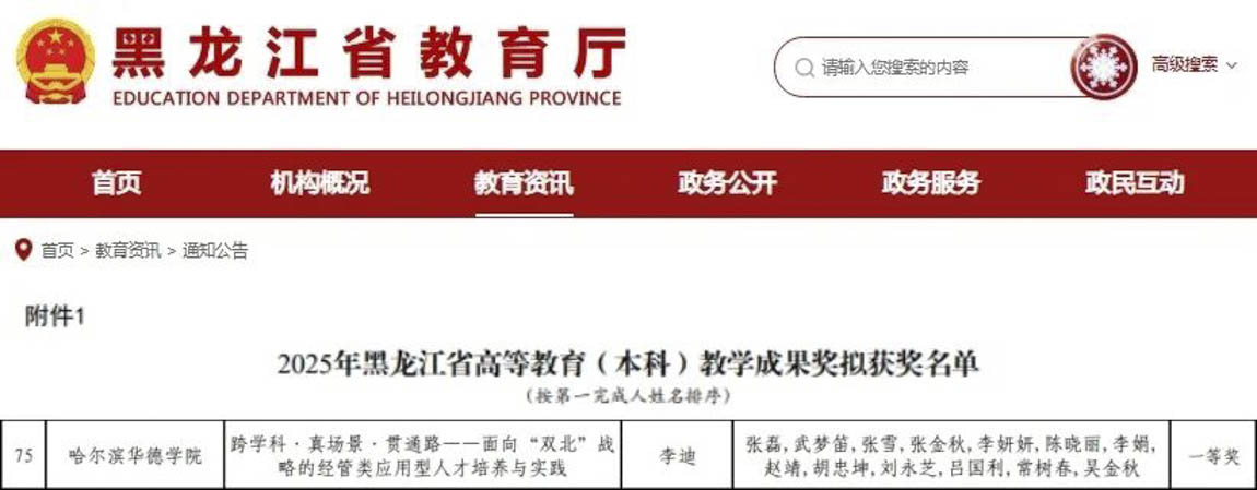 近日,黑龙江省教育厅正式公布2025年黑龙江省高等教育教学成果奖评审结果,哈尔滨华德学院《跨学科·真场景·贯通路——面向“双北”战略的经管类应用型人才培养模式研究与实践》从众多项目中脱颖而出,荣获省级教学成果奖一等奖。