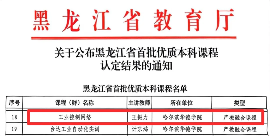近日,黑龙江省教育厅公布优质本科课程认定结果,产教融合类课程作为重点认定类别,全省仅有22门课程成功入选。哈尔滨华德学院 “工业控制网络” 课程凭借扎实的教学积淀与深度校企协同合作顺利获评,这份荣誉不仅是对课程教学质量的权威认可,更是学校与西门子数字化工业集团携手深耕产教融合、坚持以学生成长为核心的真实写照。