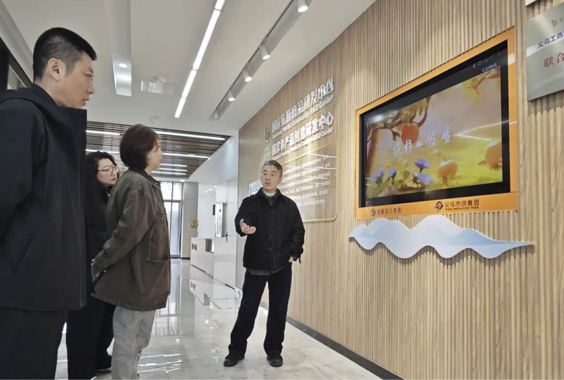 在义乌市创意园,一行人实地考察了园区的创意孵化生态,详细了解园区对设计企业的培育模式与资源整合机制。作为义乌创意产业的集聚高地,园区汇聚了各类设计机构与创新团队,形成了从创意到孵化再落地的完整产业链。团队与园区负责人王佐龙围绕校企共建实习基地、联合培育创意人才等内容达成初步共识,为学生搭建实践平台、拓宽就业渠道奠定基础。